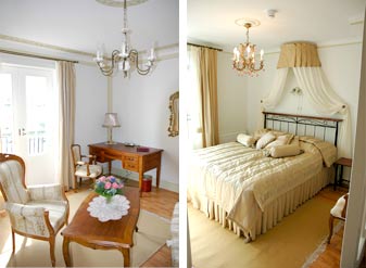 Tornin sviitti on pienimuotoista luksusta kahdessa kerroksessa - molemmissa omat ranskalaiset ikkunansa, sänky on romanttinen.
